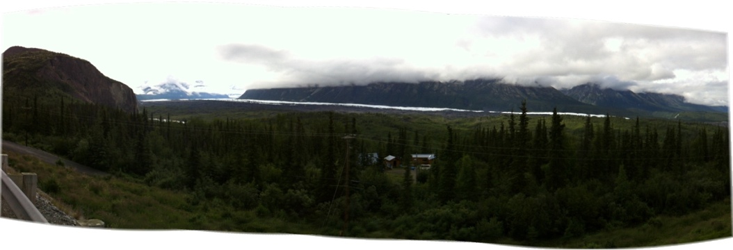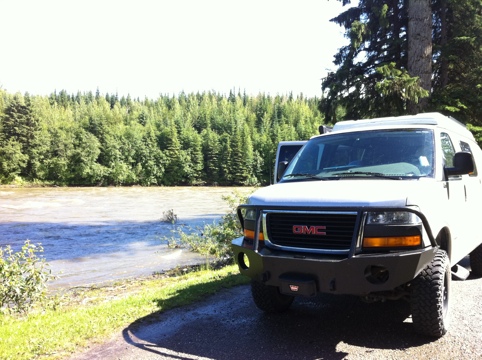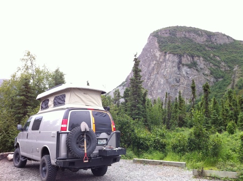 …We are rolling through Alaska today on approach to Anchorage, as we passed through Glen Allen minding the frost heaves I hear a crash like some one dropped a chandelier on a hardwood floor. Before I could figure out what happened Michel yells from the back of the van, “the back window just blew out!”.